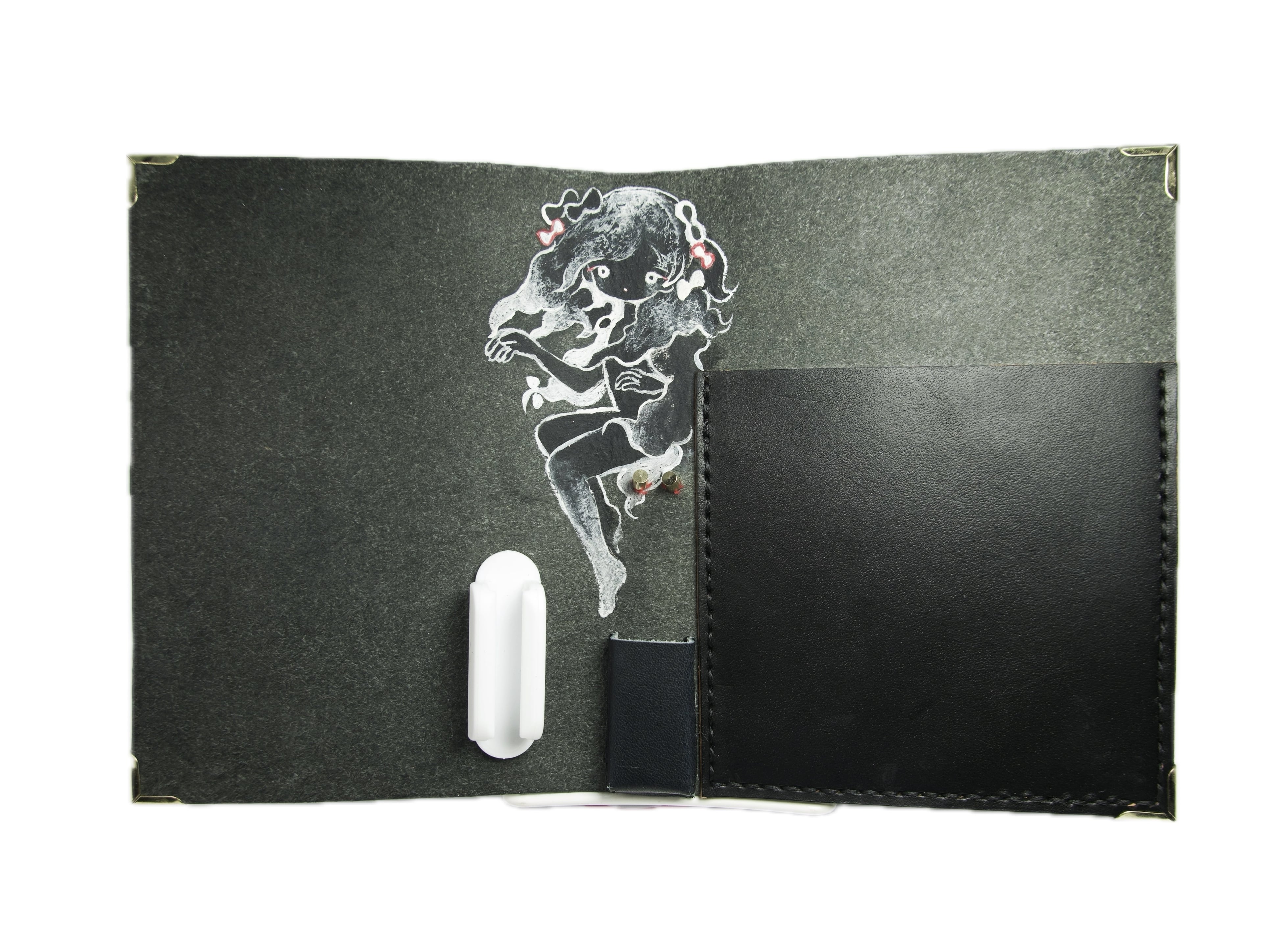 3. Open the sketchbook and insert its cover into the leather pocket.