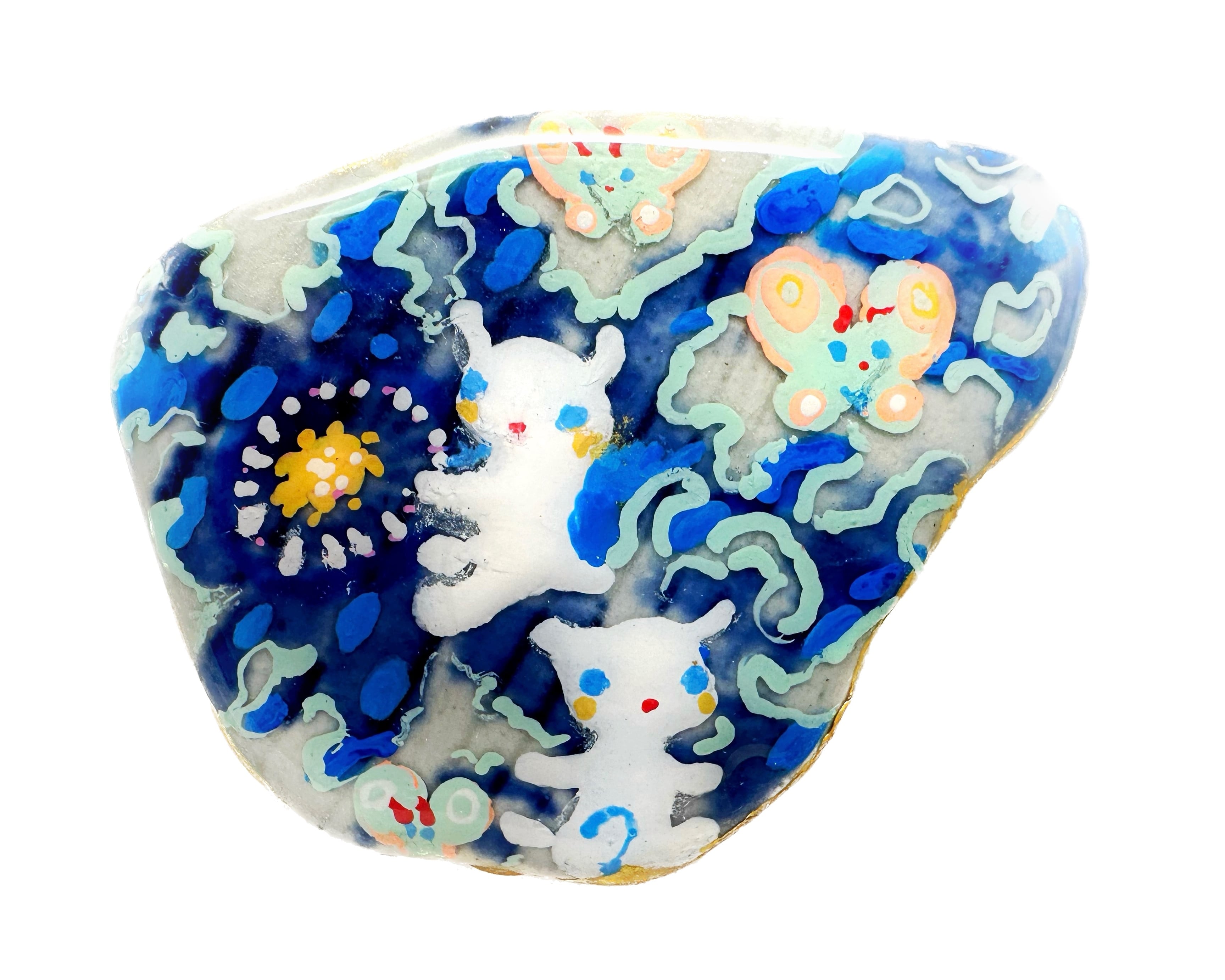 しろい子とちょうちょたちが描かれた可愛らしい陶片ブローチです。手作りならではの色合いや模様で、一つ一つ異なる表情を持っています。とても軽くて持ち運びにも便利なので、バッグや帽子など何かに付けてコーディネートのポイントにしても素敵です。